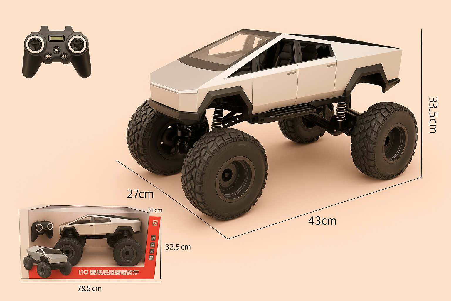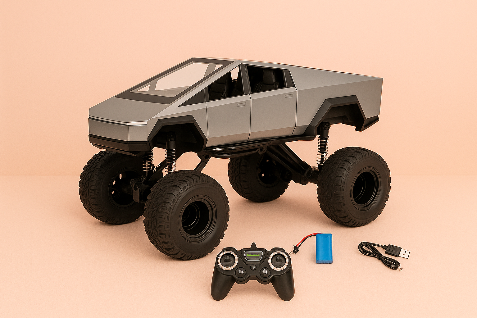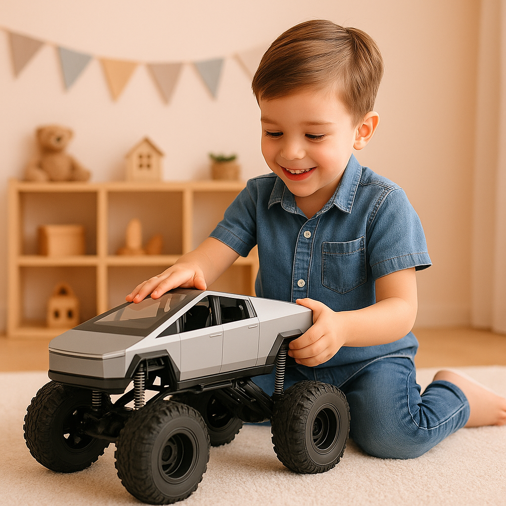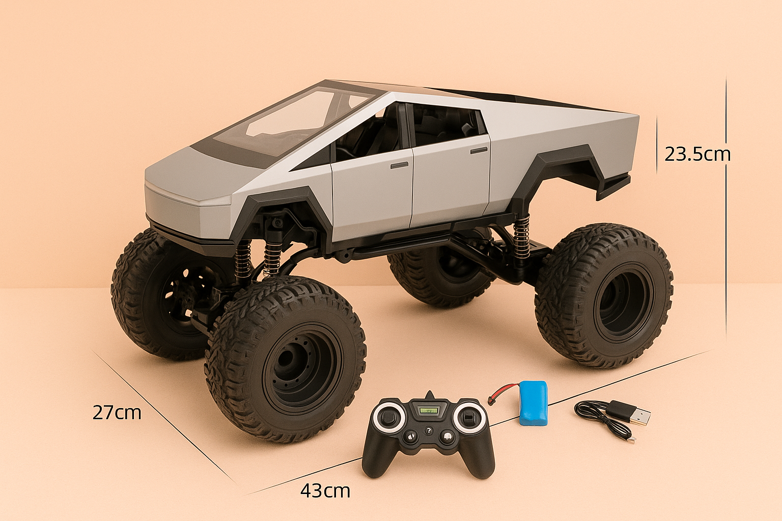 Disfruta de la potencia y el diseño futurista de la Cybertruck RC 4x4, una camioneta a control remoto inspirada en el icónico modelo original. Su estructura robusta y sus llantas de gran agarre le permiten recorrer con facilidad terrenos difíciles como tierra, piedras, arena o pasto, manteniendo siempre estabilidad y fuerza en cada movimiento.