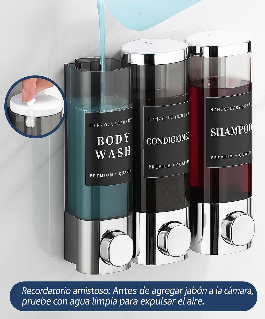 Dale a tu baño un toque moderno y funcional con este dispensador de champú de 3 cámaras montado en pared, diseñado para combinar elegancia, practicidad y durabilidad en un solo producto.