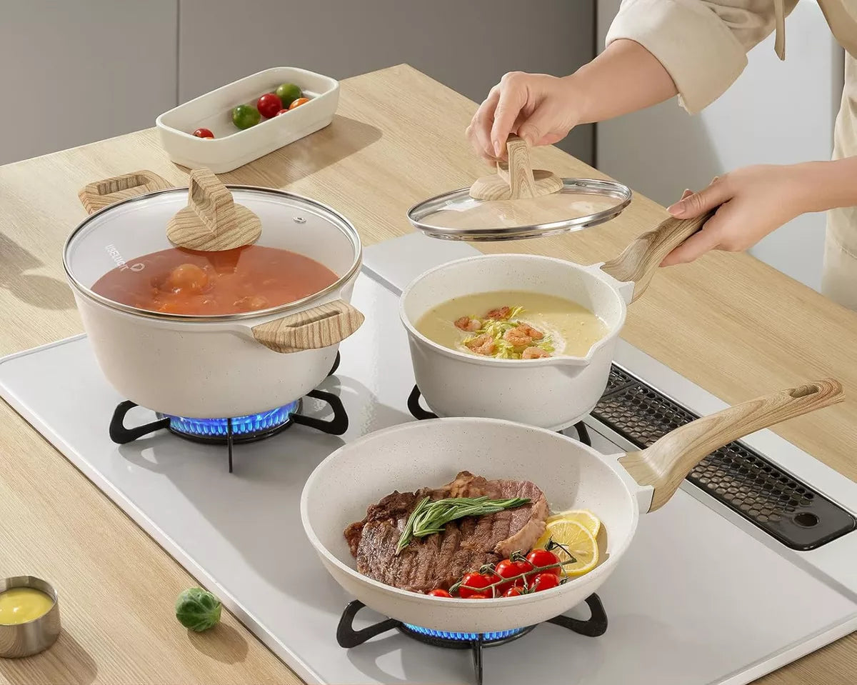 Cada juego de ollas y sartenes Useluck antiadherente está diseñado para una fácil limpieza y mantenimiento, se recomienda lavar a mano para obtener los mejores resultados; además es libre de PFOA, Pb y Cd, su superficie resistente a las manchas ofrece un rendimiento duradero.