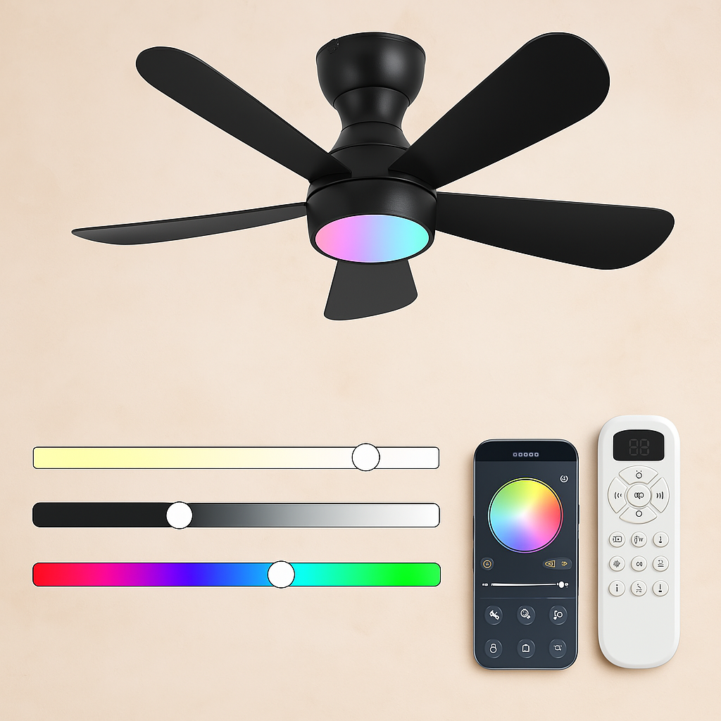 Se controla fácilmente con control remoto o desde una app móvil. Puedes ajustar entre 6 velocidades, cambiar la luz, programar el apagado automático y encender luz y ventilador por separado, todo desde tu sofá o celular.